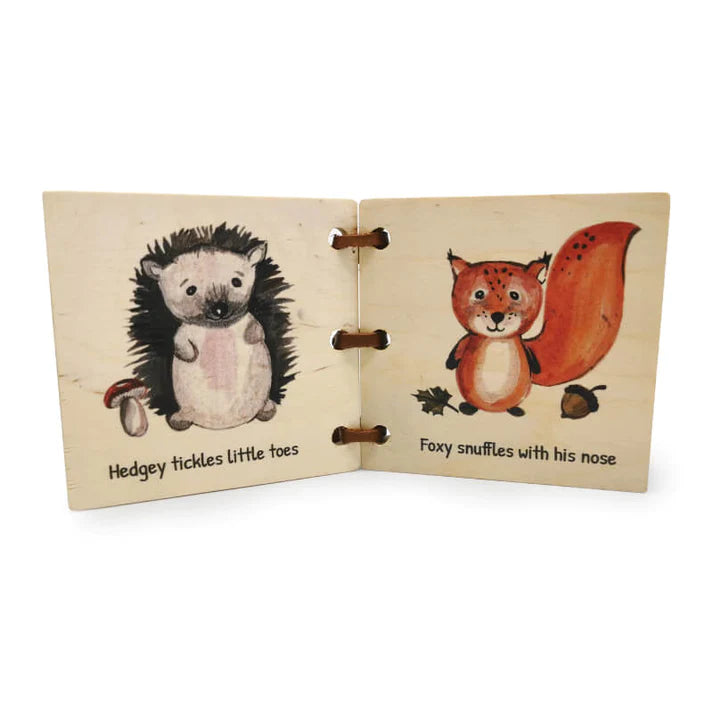 This little wooden book is a perfect first read for baby. Let them turn the pages and delight in the simple story of their forest friends. Made from birch ply with 100% genuine leather ties. Comes in its own handmade cloth bag. A perfect little gift.